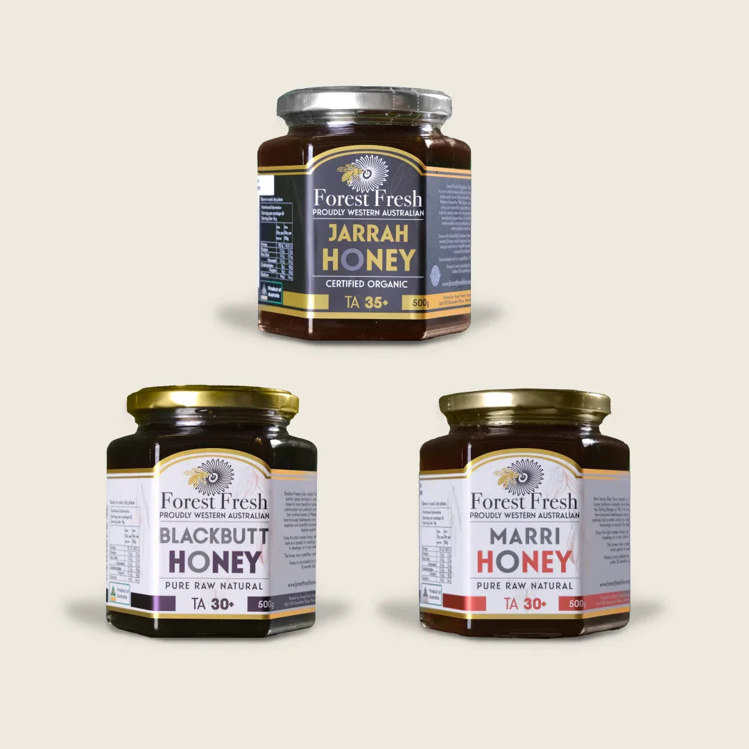Many supermarket honeys are not pure, raw and/ or natural Australian honeys. They are often heat treated, or blended. Supermarket honey is often made from a mix of local and imported honey, including from China, where it is made in factory like conditions. The honey may also have been collected in agricultural areas, meaning it may have been contaminated by various chemicals or pesticides. All of our honey is pure, raw, natural and rare from Western Australia. There are smaller quantities available of the honeys we stock, more precise and complicated processes for extracting in the forests and testing, and much stronger medicinal properties as a result of all of these factors.